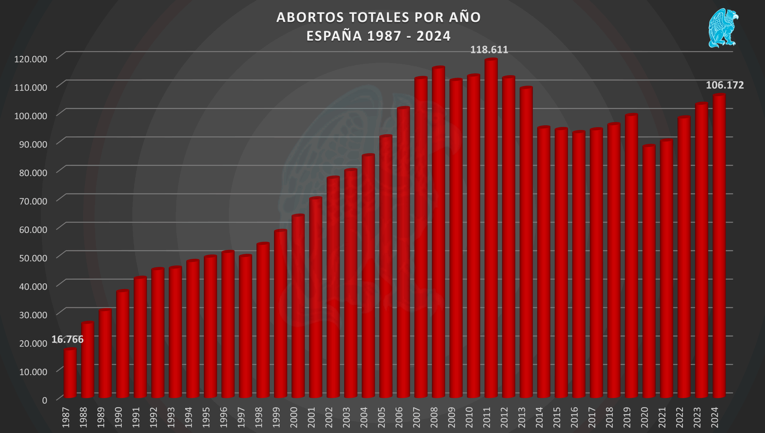 Los 106.172 abortos de 2024 hacen que la tasa por cada 1.000 mujeres (de entre 15 y 44 años) se sitúe en el 12,36. Muy por encima del mínimo más reciente de 2016, tasa 10,36 (93.131 abortos) a sólo 11 puntos básicos por debajo del máximo de la serie alcanzado en 2011 con 118.611 abortos y una tasa del 12,47%. (No he incluido en la valoración 2020 -tasa 10,33-, año excepcional en cuanto al número de abortos -y embarazos- por el inconstitucional confinamiento al que fuimos sometidos).